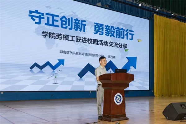 學(xué)院優(yōu)秀校友、長(zhǎng)沙市邵陽(yáng)縣商會(huì)常務(wù)副會(huì)長(zhǎng)單位、長(zhǎng)沙市優(yōu)秀青年企業(yè)家、長(zhǎng)沙市雨花區(qū)人大代表、政協(xié)委員、湖南草字頭生態(tài)環(huán)境建設(shè)有限公司董事長(zhǎng)蔣茂森,講述了他15年創(chuàng)業(yè)之路中難忘的創(chuàng)業(yè)故事,結(jié)合自身經(jīng)歷,鼓勵(lì)大家要不懼困難、堅(jiān)守信念,在學(xué)好專業(yè)知識(shí)的同時(shí),還要注重培養(yǎng)獨(dú)立思考的能力和創(chuàng)新意識(shí)。