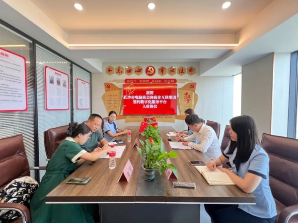 2024年9月9日上午,長沙市電腦商會秘書長唐要軍和秘書蔡敏赴商企互聯(lián)集團進行數(shù)字化服務(wù)平臺入駐協(xié)議簽約儀式。在正式簽約之前,一行人在會議室就平臺功能、板塊分區(qū)、操作建設(shè)等內(nèi)容展開了座談交流會。